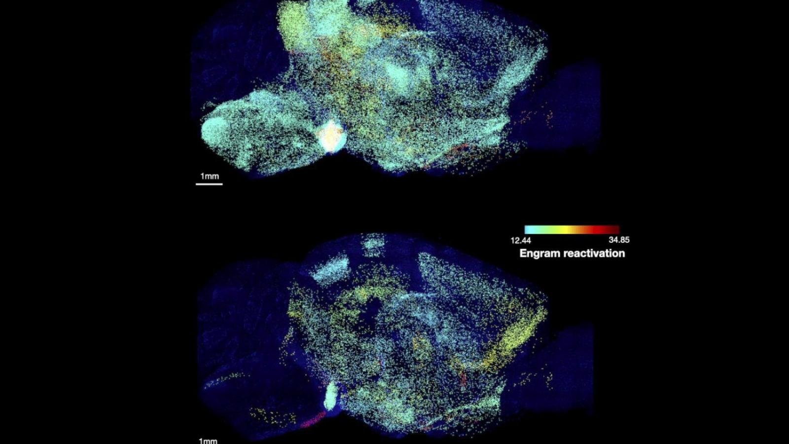 Or ce qu’il avait réalisé alors dans une structure particulière du cerveau (le gyrus dentelé, la « porte d’entrée » de l’hippocampe), le laboratoire de Tonegawa vient de le réussir à l’échelle du cerveau entier de la souris ! Je mets un point d’exclamation, mais je devrais en mettre au moins dix tellement l’exploit technique est remarquable. Et les résultats convaincants et fascinants : le cerveau des mammifères semblent stocker le simple souvenir d’une peur conditionnée dans d’innombrables régions cérébrales pour former un vaste engramme fonctionnellement unifié. Et parmi la centaine de régions impliquées dans cet engramme, beaucoup n’étaient pas des « suspects habituels » comme l’hippocampe, l’amygdale ou le cortex. Il y en avait par exemple plusieurs régions du thalamus, du mésencéphale ou du tronc cérébral.